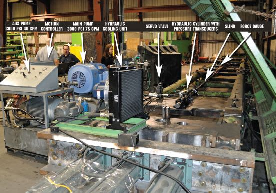 In Holloway’s test system, the rope sling needed to be cycled at four cycles per second. The rope warms up and stretches as it is cycled, and as it stretches, more “pull” is re quired to achieve the equivalent stretching force. The test that the DoD required was to apply tons of force to the sling, cycling the force between a maximum and minimum value, at a rate exceeding four times per second. After cyc ling for five or six minutes, the sling is allowed to cool down. Then the process is repeated until a specified accumulated runtime is reached.