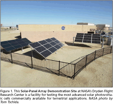 A state-of-the-art solar-panel array demonstration site at NASA’s Dryden Flight Research Center provides a unique opportunity for studying the latest in high-efficiency solar photovoltaic cells. This five-kilowatt solar-array site (see Figure 1) is a technology-transfer and commercialization success for NASA. Among the solar cells at this site are cells of a type that was developed in Dryden Flight Research Center’s Environmental Research Aircraft and Sensor Technology (ERAST) program for use in NASA’s Helios solar-powered airplane. This cell type, now denoted as A-300, has since been transferred to SunPower Corporation of Sunnyvale, California, enabling mass production of the cells for the commercial market.