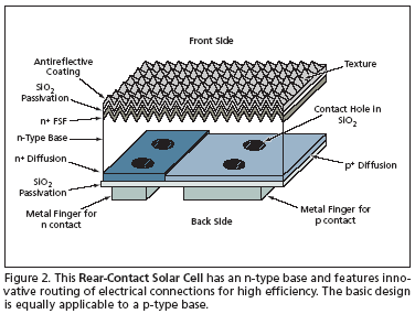 High efficiency separates these advanced cells from typical previously commercially available solar cells: Whereas typical previously commercially available cells are 12 to 15 percent efficient at converting sunlight to electricity, these advanced cells exhibit efficiencies approaching 23 percent. The increase in efficiency is due largely to the routing of electrical connections behind the cells (see Figure 2). This approach to increasing efficiency originated as a solution to the problem of maximizing the degree of utilization of the limited space available atop the wing of the Helios airplane. In retrospect, the solar cells in use at this site could be used on Helios, but the best cells otherwise commercially available could not be so used, because of their lower efficiencies.