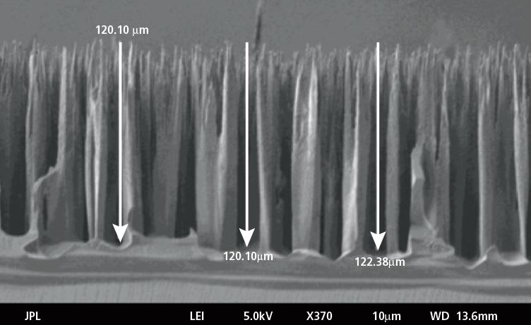 In addition, the wick fabrication technique produces nanostructure forests that are planar, and can take advantage of 2D heat spreading over a surface vs. stateof- the-art 1D heat transport associated with heat pipes. The combined result of these benefits promises to be a two-phase heat transfer device, which is very insensitive to a gravity field. Although liquid pressure drops may be relatively large depending on the nanostructure density, the overall device dimensions of ≈ 7×7 cm are expected to be well within the overall capillary limit. The novel aspects of the currently proposed effort include the use of the phenomenon of superhydrophilicity in a heat pipe, and the wick geometry, control of the nanotip height density, and the method for creating this nanotip texture. A cryo-etch inductively coupled plasma is used to make the nanotips, enabling the cost-effective, mask-free formation of a uniform black silicon surface over a large area, with nanotip heights exceeding 100 microns. Unlike nanotextured surfaces formed by the growth or deposition of materials (e.g. carbon nanotubes), the resulting formations are robust and compatible with liquid processes.