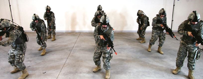 Effective simulation training for a nine-unit combat squad (see Figure 1) in the US Army poses significant challenges. How do you immerse a squad so they feel they are in a battle environment? How do you teach or reinforce key muscle memory of visual scanning, weapons movement, or replacing weapons clips while in a simulator? Putting a squadron, a keyboard, and a mouse at a computer screen may provide some visual cues, but it does not teach or reinforce muscle memory that will help soldiers in a real battle environment; clicking on a mouse button is not the same as holding, aiming, and firing a real weapon.