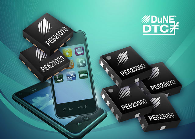 Peregrine Semiconductor Corporation (San Diego, CA), a fabless provider of high-performance radio frequency integrated circuits (RFICs), announced that it has expanded its DuNE™ Digitally Tunable Capacitor (DTC) product line with six second-generation devices for antenna tuning in 4G LTE smartphones. The PE623060, PE623070, PE623080, and PE623090 (PE6230x0) DTCs have a capacitance range of 0.6 – 7.7 pF and support main antenna power handling of up to +34 dBm. The PE621010 and PE621020 (PE6210x0) DTCs have a capacitance range of 1.38 to 14.0 pF and are optimized for power handling of up to +26 dBm, making them well suited for diversity antennas. All of the new DTCs are manufactured on Peregrine’s UltraCMOS® technology process, with HaRP™ technology enhancements that enable the devices to meet the challenging harmonic and linearity requirements of LTE. The highly-versatile devices support a wide variety of tuning circuit topologies, with an emphasis on impedance matching and aperture-tuning applications.