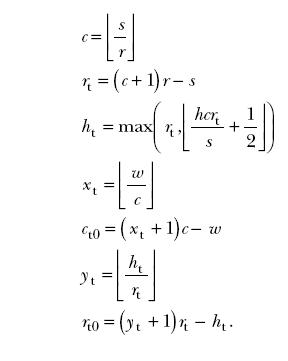 The steps of the algorithm are the following: First, r is computed. If h > (s – 1)w then r = s. Otherwise, r is the unique positive integer that satisfies (r – 1)rw < hs ≤ (r+1)rw. Some of the other parameters are computed as follows:
