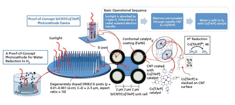 A typical unit cell will then consist of a Si post covered with CNT, providing enhanced surface area for the catalyst. The device will then be dipped into a solution of Co[TArP] to enable coating of CNT with Co(P). The Si/CNT/Co[TArP] assembly then will provide electrons for water splitting and hydrogen gas production. A potential of 1.23 V is needed to split water, and near ideal band gap is approximately 1.4 eV. The combination of doped Si/CNT/Co [TArP] will enable this redox reaction to be more efficient.