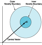 The construction of a spindle involves four vital parameters: setup size, spindle-population size, and the radii of two novelty boundaries. The setup size is the number of vectors that are taken into account before computing C. The spindle-population size is the total number of input vectors used in constructing the spindle — counting both those that arrive before and those that arrive after the computation of C. The novelty-boundary radii are distances from C that partition the neighborhood around C into three concentric regions (see Figure 1). During construction of the spindle, the changing spindle radius is denoted by h. It is the final value of h, reached before beginning construction on the next spindle, that is denoted by r.