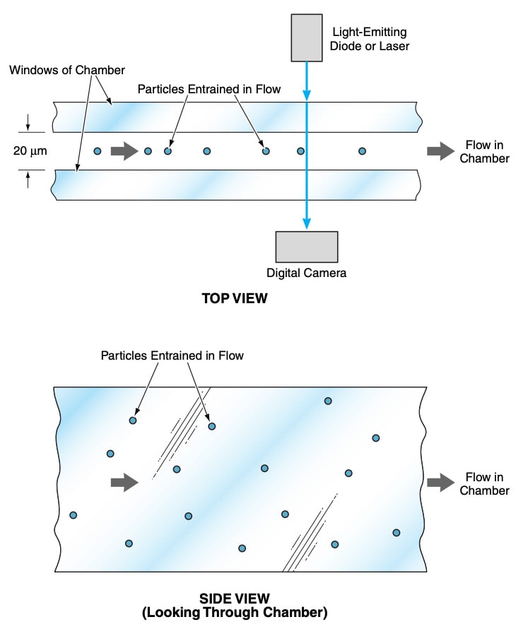 The chamber is only 20 µm thick, and the liquid is pumped through it at a rate of about to 200 µL/min, giving rise to a low-shear laminar flow that forces the entrained microparticles to move across the chamber abreast. Hence, no microparticle shadows another microparticle, and as a result, every microparticle can be op-tically observed and analyzed separately from every other microparticle.