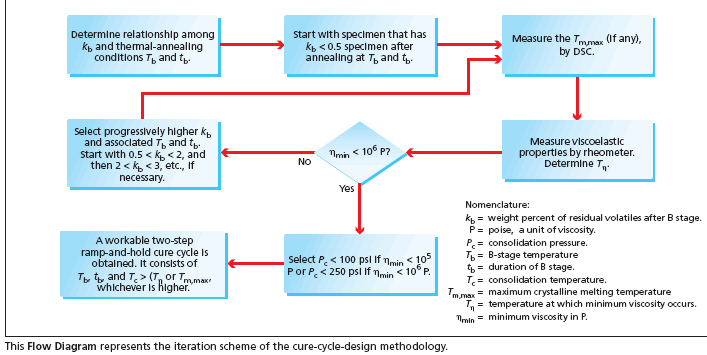 The subject resin/fiber composite material is considered unprocessable (in that a laminated part made of this material cannot be made free of voids) under moderate pressures when the abovementioned criteria cannot be satisfied concurrently. It is possible to refine the cure cycle by narrowing the B-stage pretreatment conditions in the TGA, DSC, and meltrheometry analyses.