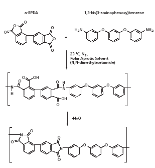 In the example of the figure, a-BPDA was reacted with 1,3-bis(3-aminophenoxy) benzene in N,N-dimethylacetamide, at a solids content of 20 weight percent, to obtain a polyamide acid having an inherent viscosity of 0.73 dL/g. A thin-film cast from the polyamide acid on plate glass was stage-dried for 1 hour at a temperature of 250 °C in air. The 0.066- mm thick film was nearly colorless and exhibited a transparency of 86 percent at a wavelength of 500 nm. The Tg of the film was found to be 207 °C. At a temperature of 23 °C, the film exhibited the following tensile properties: strength of 16 kpsi (≈110 MPa), modulus of 476 kpsi (≈3.28 GPa), and elongation of 6 percent. The film acquired a pale yellow color when it was further cured for 1 hour at 350 °C in air. The Tg increased to 209 °C and the tensile properties at 23 °C changed slightly to strength of 18 kpsi (≈124 MPa), modulus of 476 kpsi (≈3.28 GPa), and elongation of 5.7 percent.