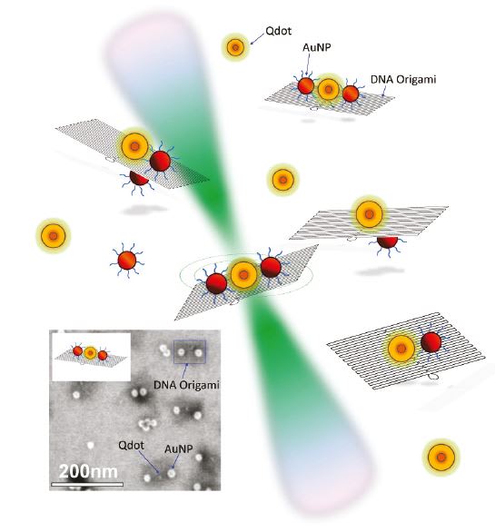 Liddle and his colleagues made several groups of DNA rectangles, each with a different configuration of quantum dots and gold particles in a solution. Using a laser as a spotlight, the team was able to follow the movement of individual DNA rectangles in the liquid, and also could detect changes in the fluorescent lifetime of the quantum dots when they were close to gold particles of different sizes. They also showed that they could exactly predict the lifetime of the fluorescence of the quantum dot depending on the size of the nearby gold nanoparticles.