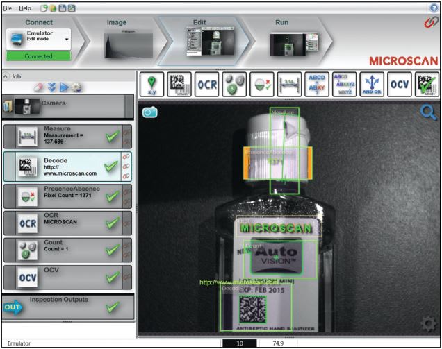 Microscan’s patented software technology recreates objects on a target platform rather than interpreting them, allowing for portability from one hardware device to another. Objects on a smart camera and PC, for example, are the exact implementation and sequence of objects; adding new functionality to a smart camera is the same as adding to a PC. By way of contrast, using an interpretive model would require two separate development efforts.