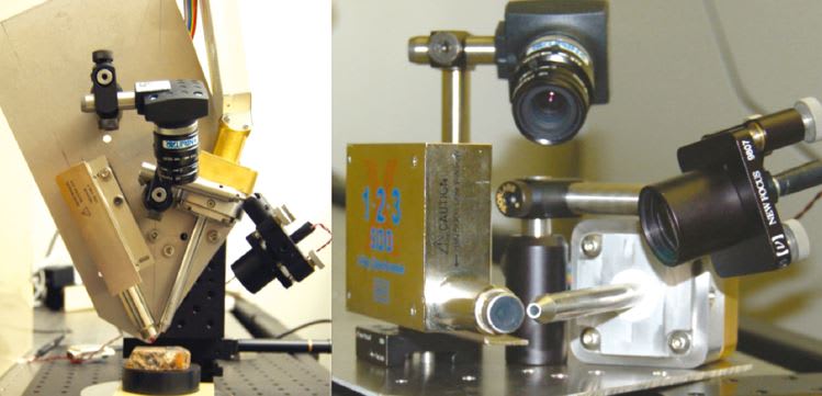 The instrument includes an Amptek SDD that draws 2.5 W and has a resolution of 135 to 155 eV FWHM at 5.9 keV. It weighs 180 g, including the preamplifier, digital pulse processor, multichannel analyzer, detector and preamp power supplies, and packaging. Rock samples are positioned relative to the instrument by a three-axis arm whose position is controlled by closed-loop translators (mimicking the robotic arm of a rover). The distance from the source to the detector is calculated from the position of a focused laser beam on the sample as imaged by the camera. The instrument enables quick scans of major elements in only 1 second, and rapid acquisition (30 s) of data with excellent signal-to-noise and energy resolution for trace element analysis.