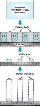 In the present version (see figure), one would begin by dissolving a PS/PMMA diblock copolymer with an ionic salt of a suitable catalytic metal (e.g., FeCl3) in a suitable amphiphilic solvent (e.g., acetone). The solution would be spin-coated onto a substrate, then heated so that the PS/PMMA block copolymer would form itself into pillars of PMMA in a PS matrix. During the heating, the Fe3+ and Cl– would be expected to migrate to the PMMA regions, wherein the local dipoles in the oxygen-containing moieties would tend to attract and bind the ions. The resulting block copolymer film would contain a regular array of iron-rich and iron free regions with nanometer dimensions. The polymer would then be oxidized away by heating to a temperature of 400 °C in air, leaving a regular array of nearly identically sized and shaped iron oxide dots on the substrate. The substrate and dots would be heated in hydrogen to reduce the iron oxide dots to iron. Thereafter, carbon nanotubes would be grown on the iron dots as described above.