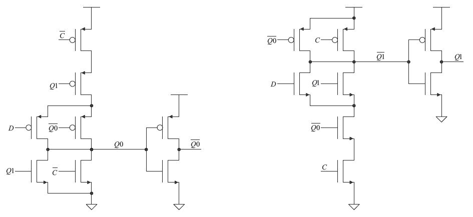 An efficient CMOS (complementary metal oxide semiconductor) implementation of this circuit is shown in the figure, where C is the comparator output, D is the data (code), and Q0 and Q1 are the outputs indicating the capture of a zero or one value. The latch for Q0 has a negative-true set signal and output, and is implemented using OR-AND-INVERT logic, while the latch for Q1 uses positive-true signals and is implemented using AND-OR-INVERT logic. In this implementation, both latches are cleared when the comparator is reset. Two redundant transistors are removed from the reset side of each latch, making for a compact layout.