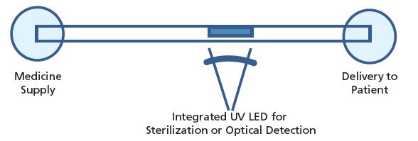 Certain materials, such as TiO2, have germicidal and anti-fouling properties when they are illuminated with UV light. The proposed delivery device contacts medicine with this high-surface-area black silicon surface coated with a thin-film germicidal deposited conformally with ALD. The coating can also be illuminated with ultraviolet light for the purpose of sterilization or identification of the medicine itself. This constrained volume that is located immediately prior to delivery into a patient, ensures that the medicine delivery device is inherently sterile.