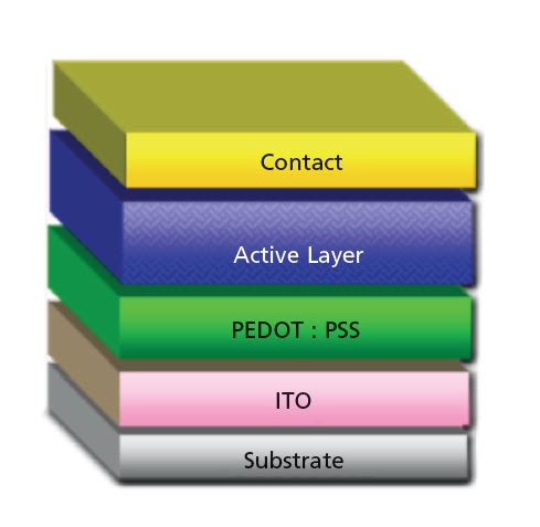 - Interlayer. Usually made from conducting polymer PEDOT:PSS. It serves to smooth ITO’s surface and increase its work function.