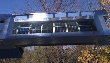 These concentrators gather, intensify, and focus sun beams upward, aiming at a fixture containing specialized silicon concentrated PV chips—the actual solar cells. If you stay by the array for a while, you’ll notice that the solar concentrators follow the path of the sun throughout the day, changing position to best capture and utilize the sunlight.