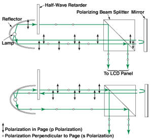 For the portion of unpolarized lamp light that would hit the half-wave retarder first, the end result would be the same, though the sequence of events would differ: After passing through the half-wave retarder, the initially unpolarized light would remain unpolarized until it reached the polarizing beam splitter. The p-polarized subpart of this part of the light would pass through the beam splitter, while the s-polarized subpart would be reflected perpendicularly toward the LCD panel. The p-polarized light would strike the flat mirror and would go back through the half-wave retarder, which would convert it to s-polarized light. Continuing along its path, this portion of s-polarized light would be reflected twice by the lamp reflector, and would finally be reflected perpendicularly, by the beam splitter, toward the LCD panel.