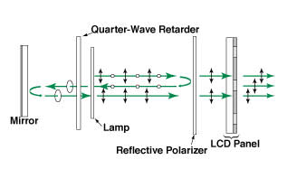 Figure 2 schematically depicts the configuration for the second proposed technique. Light from a lamp would reach a reflective polarizer; the p-polarized light would pass through to the LCD panel, while the s-polarized light would be reflected. The reflected s-polarized light would pass through a quarter-wave retarder, becoming circularly polarized. The circularly polarized light would be reflected by a flat mirror and would go back through the quarter-wave retarder, which would cause this light to become p-polarized, as needed to join the originally p-polarized light in illuminating the LCD panel.