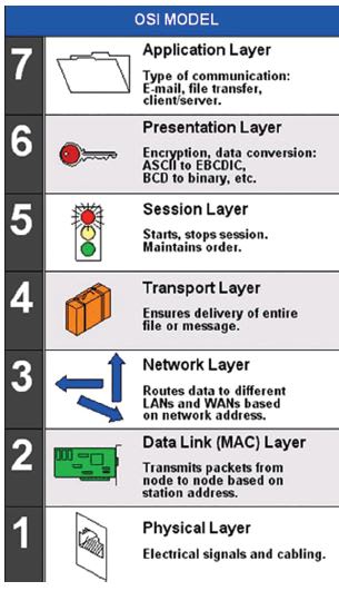The Open Systems Interconnect (OSI) TCP/IP stack is made up of 7 layers (see Figure 1). The lowest layer is the Physical Layer of fiber or copper — possibly wireless today. This interface is the means by which a node would communicate on the medium. The next layer is the Data Link (MAC) Layer. This is where information pertaining to the station address is used to link information to pass from one node to another. The third layer is the Network Layer, which works with multiple bridges and multiple cell networks. After that, the Transport Layer ensures that information is sent and delivered between a station address on one network to a station address on another network. Next, the Session Layer separates the environment for each particular application or user. Following is the Presentation Layer that ensures the information coming from the Session Layer is put into the proper format for the Application Layer to use. Lastly, the Application Layer is where the work is done; whether you are sending emails, controlling machinery, or collecting information.