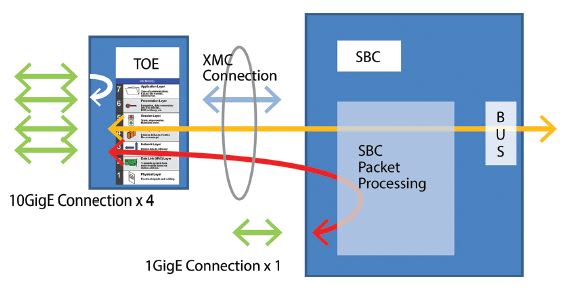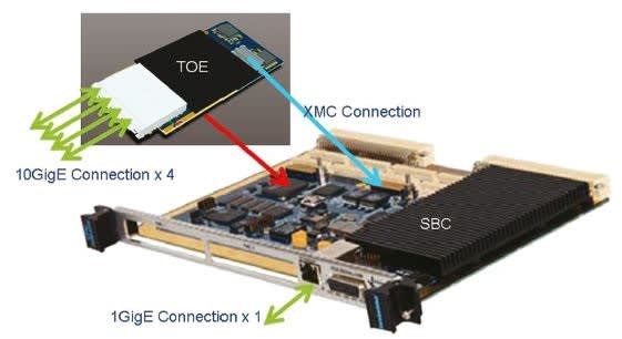 How is a TCP offload engine (TOE) integrated into an embedded system? Many single-board computers (SBC) today have XMC sites that can be used to plug in an XMC form-factored TCP offload engine that can potentially support up to four 10Gb Ethernet ports. The SBC will most likely have one or more 1Gb Ethernet ports as well, and those will be driven by the software stack executing on the SBC itself. In the context of the overall system, the TCP offload engine can provide up to four extremely high-speed ports executing in parallel with the 1Gb Ethernet port(s) on the SBC itself (see Figure 2).