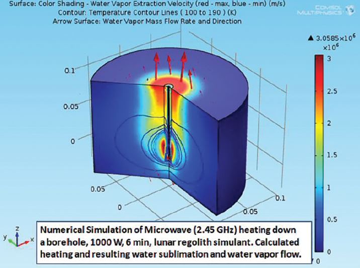 Microwave extraction laboratory experiments and numerical simulations over the past seven years demonstrate the utility of these innovative processes. FEM multiphysics numerical analysis is being used to model laboratory experiments as well as to simulate possible space experiment scenarios of microwave heating of lunar, Martian, and asteroidal regolith. Different scientific experiments and mining scenarios have been simulated for different frequencies, power, heating times, water concentrations, and for regolith with different dielectric properties.