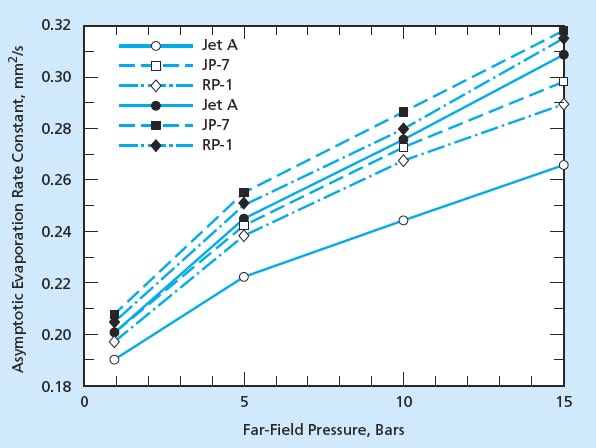 The model has been tested on three kerosenes used as aircraft and rocket fuels: Jet A, JP-7, and RP-1. The present version of the double PDF has been fitted to the discrete species distributions of these kerosenes and extensive calculations of evaporation of isolated drops performed. The results show that under the assumption of a quasi-steady gas phase, a relation known in the literature as the D2 law (pertaining to the rate of decrease of the square of the drop diameter) is recovered after an initial dropheating transient. A related quantity known in the literature as the asymptotic evaporation rate constant has been found to be an increasing function of the far-field temperature and pressure, a complex function of far-field composition, and a weak function of the difference between the drop-surface and farfield vapor molar fractions. In a comparison between results obtained (a) under the assumption that the interior of the drop is well mixed (the "wm" assumption) and (b) under the assumption that the drop can evaporate either in a wellmixed mode or at unchanging (frozen) composition (the "wm-fc" assumption), it was found that the differences between the asymptotic evaporation rate constants under the two assumptions is within the range of uncertainty in the transport properties (see figure).