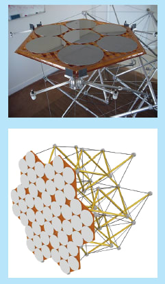 The upper part of Figure 1 shows a small-scale prototype of a developmental class of lightweight, deployable structures that would support panels in precise alignments. In this case, the panel is hexagonal and supports disks that represent segments of a primary mirror of a large telescope. The lower part of Figure 1 shows a complete conceptual structure containing multiple hexagonal panels that hold mirror segments.
