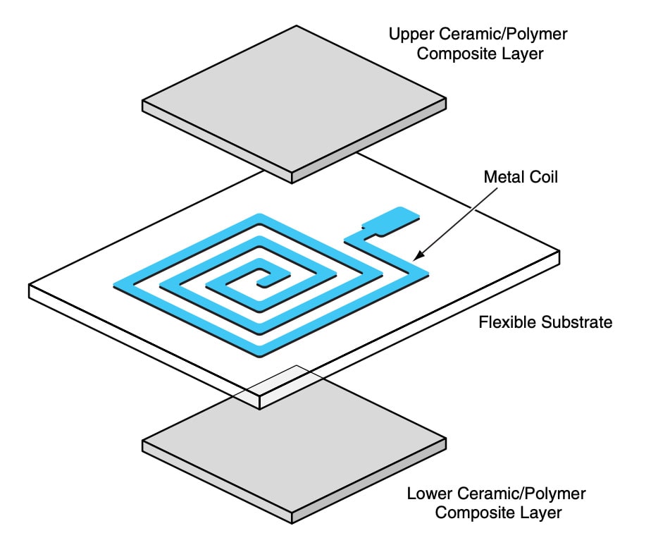 The microinductor comprises a planar spiral metal coil and a high-permeability magnetic thick-film (equivalent to the core of a conventional inductor) in the form of a ceramic/polymer composite. The metal spiral is fabricated by photolithography and etching of a copper-clad flexible polyamide substrate. The ceramic/polymer composite is deposited by stencil and screen printing, both above and below the metal spiral (see figure).