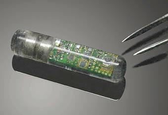 Transmitter power is supplied by two silver oxide batteries; at an average power consumption <40 µW, the operational lifetime ranges from 4 to 6 months. The fully developed transmitting unit would be electronically identical to a larger prototype that has already been constructed (see Figure 2), but would be miniaturized by following the chip-on-board approach, in which unpackaged integrated-circuit chips are flip-chip bonded directly onto a printed-circuit board along with other components. The transmitter is encapsulated in biocompatible silicone rubber.