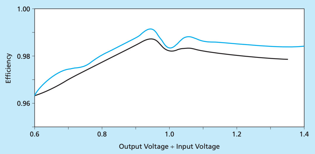 The weight and power loss of a DC-to-DC converter are determined primarily by the amount of power processed. In the SCBBR, the unswitched majority of the power is passed through with very little power loss, and little if any increase in the sizes of the converter components is needed to enable the components to handle the unswitched power. As a result, the power-conversion efficiency of the regulator can be very high, as shown in the example of Figure 1.