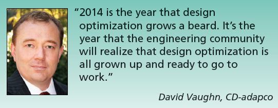 Design optimization will continue to gain importance. Industry has struggled to work the technology into its mainstream engineering processes, but according to Vaughn, “2014 is the year that design optimization grows a beard. It is the year that the engineering community will realize that design optimization is all grown up and ready to go to work.”