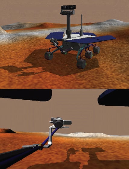 Part of the Rover Analysis, Modeling and Simulation (ROAMS) software that synthesizes images of terrain has been augmented to make the images more realistic. [ROAMS was described in "Simulating Operation of a Planetary Rover" (NPO-30722), NASA Tech Briefs, Vol. 28, No. 9 (September 2004), page 52. ROAMS simulates the operation of a robotic vehicle (rover) exploring terrain on a remote planet.] The images are needed for modeling responses of rover cameras that provide sensory inputs for machine-vision-based algorithms for controlling the motion of the rover. The augmented image-synthesizing part of the ROAMS software supports terrain geometry and texture specifiable by the user, CAHV and CAHVOR camera models, and more-realistic shadowing (see figure). (The letters in "CAHV" represent vectors in a standard photogrammetric model of a pinhole camera. Letters O and R in "CAHVOR" represent vectors used to model distortions.) A contemplated future version of ROAMS would support the CAHVORE model, which represents more-general cameras, including those having fish-eye or other wide-field-of-view lenses. (Letter E in "CAHVORE" represents a vector used to model apparent motion of a camera entrance pupil.)