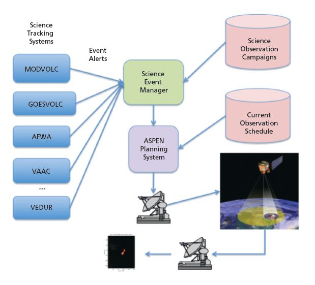 This work demonstrates an effort to integrate spaceborne sensing from MODIS (Terra and Aqua), ALI (EO-1), Worldview-2, and in situ sensing in an automated scheme to improve global volcano monitoring. Specifically, it is a “sensor web” concept in which a number of volcano monitoring systems are linked together to monitor volcanic activity more accurately, and this activity measurement automatically tasks space assets to acquire further satellite imagery of ongoing volcanic activity.
