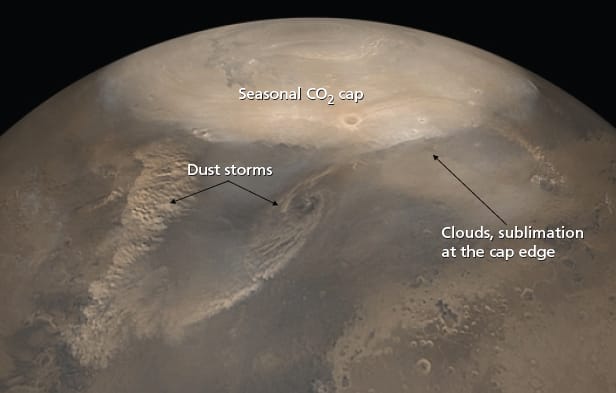 Researchers at NASA’s Jet Propulsion Laboratory have developed a method for automatically tracking the polar caps on Mars as they advance and recede each year (see figure). The seasonal Mars polar caps are composed mainly of CO2 ice and are therefore cold enough to stand out clearly in infrared data collected by the Thermal Emission Imaging System (THEMIS) onboard the Mars Odyssey spacecraft. The Bimodal Image Temperature (BIT) histogram analysis algorithm analyzes raw, uncalibrated data to identify images that contain both “cold” (“polar cap”) and “warm” (“not polar cap”) pixels. The algorithm dynamically identifies the temperature that separates these two regions. This flexibility is critical, because in the absence of any calibration, the threshold temperature can vary significantly from image to image. Using the identified threshold, the algorithm classifies each pixel in the image as “polar cap” or “not polar cap,” then identifies the image row that contains the spatial transition from “polar cap” to “not polar cap.” While this method is useful for analyzing data that has already been returned by THEMIS, it has even more significance with respect to data that has not yet been collected. Instead of seeking the polar cap only in specific, targeted images, the simplicity and efficiency of this method makes it feasible for direct, onboard use. That is, THEMIS could continuously monitor its observations for any detections of the polar-cap edge, producing detections over a wide range of spatial and temporal conditions. This effort can greatly contribute to our understanding of long-term climatic change on Mars.