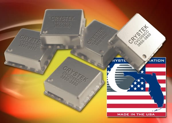 Crystek's (Fort Meyers, FL) CVCO55CC-3850-3850 VCO (Voltage Controlled Oscillator) operates at 3850 MHz with a control voltage range of 0.5V~4.5V. This VCO features a typical phase noise of -110 dBc/Hz @ 10KHz offset and has excellent linearity. Output power is typically +7 dBm. Engineered and manufactured in the USA, the model CVCO55CC-3850-3850 is packaged in the industry-standard 0.5-in. x 0.5-in. SMD package. Input voltage is 8V, with a max. current consumption of 35 mA. Pulling and Pushing are minimized to 1 MHz and 0.2 MHz/V, respectively. Second harmonic suppression is -15 dBc typical.