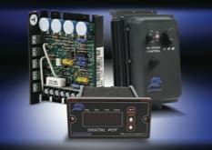 IronHorse GSD1 series DC drives from AutomationDirect (Cumming, GA) are Pulse-Width-Modulated (PWM) controllers for 12- to 36-Volt battery/solar-powered equipment. Design features include adjustable maximum/minimum speed, current limit, I.R. compensation, and acceleration. The adjustable current-limit feature protects the control, battery, and motor from sustained overloads. The drives, available up to 1/4 hp, are available in open-frame and NEMA 4X enclosed styles, and all come standard with a speed pot, knob, and dial plate; an optional 0-10VDC analog input signal card is also available.