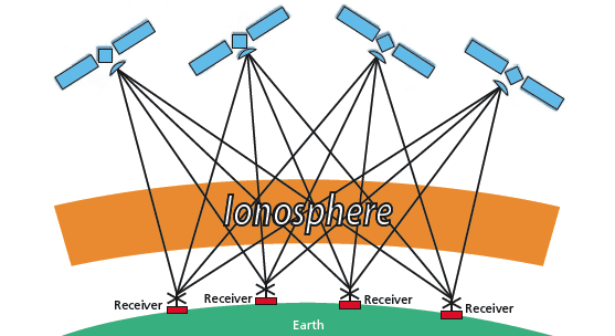 - The innovation is focusing on the atmospheric, not ionospheric, atmosphere component. The atmosphere rests directly above the ground-based assets (shown as receivers in the figure), starting at zero altitude. The atmospheric geometry provides greater geometric diversity than occurs in the ionosphere, producing improved vertical resolution.