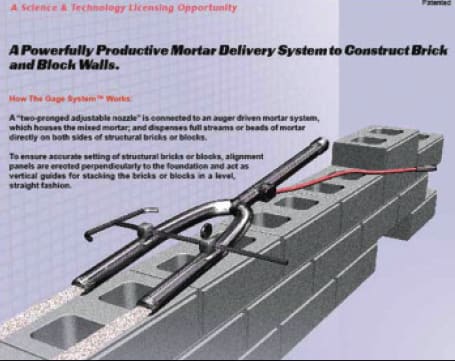Alignment panels, erected perpendicularly to the foundation, keep the wall plumb, straight, and level during the laying of each row of bricks. Utilizing a precise mortar dispenser, the Gage System enables a well-constructed and fortified wall to be built in a time-saving and efficient manner.