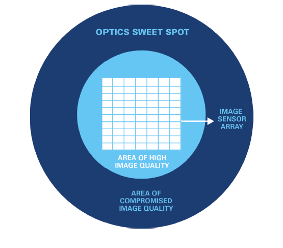 Cameras, more and more, are incorporating larger sensors and sensors with very small pixel structures, making selection of an adequately performing lens all the more critical to achieving maximum system performance. Make sure your lens is large enough to fit the entire sensor within the “sweet spot” at the center of the field of view (Figure 2).