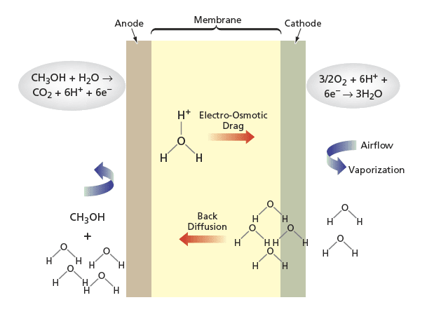 The figure schematically depicts the transport processes involved in the operation of a direct methanol fuel cell (whether of prior or proposed design). Methanol is oxidized to protons and carbon dioxide at the anode, and oxygen is reduced to water at the cathode. As protons migrate from the anode to the cathode through a proton-conducting membrane that is part of a membrane/electrode assembly, water is transported along with them by electro-osmotic drag: in other words, water molecules associated with the protons are dragged along with the protons. Air flowing over the cathode evaporates some of the water. However, some of the water tends to diffuse back toward the anode because the concentration of water at the cathode exceeds the concentration of water in the methanol-water solution at the anode (this diffusion is hereafter denoted "back diffusion"). Water is consumed at the anode by the oxidation of methanol, and water is produced at the cathode by reduction of oxygen.