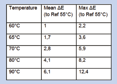 Figure 3 illustrates the color shift caused by a change in LED temperature. The listed values are the mean and maximum color distances in lab space, measured on a Color Checker test chart and referenced on the 55 °C-Values.