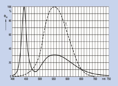 Figure 7 shows the blue peak near 440 nm of the blue LED inside a white LED. The remaining part of the spectrum results from the conversion material (phosphors). Technology-wise it is a challenge for LED manufacturers to keep the color of white LEDs stable. There are tolerances in the blue chip and additional tolerances in the conversion material. This all leads to unwanted variations in white colors produced within the same production line. Consequently, LED manufacturers classify LEDs into different groups. Each group (binning) has a certain tolerance range with respect to efficiency and color. This should be considered when selecting an illumination source. If the illumination modules differ in color from piece to piece, or even inside the same illumination unit, it will complicate the image analysis.