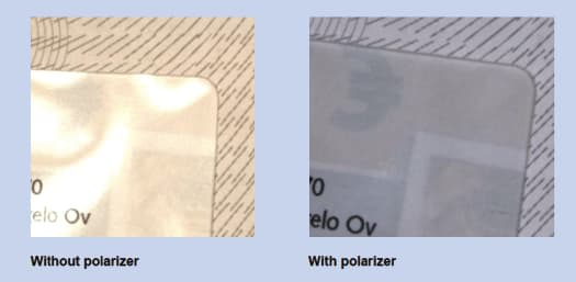 Reflecting materials or surfaces are always a challenge with respect to illumination. In combination with a 90 degree rotated polarizer in front of the camera, unwanted light reflections can be eliminated (Figure 8).