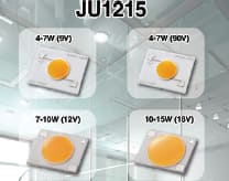 Everlight Electronics Co. Ltd. (Taipei, Taiwan) has expanded its high performance JU series of chip-on-board (COB) LEDs to include 7, 10 and 15 W types in addition to the existing 4W version. The JU series now consists of four JU1215 (15×12×1.6mm) and one JU2024 (20×24×1.6mm) type/s with powers ranging from 4 watts to 15 watts. All types provide an efficacy of 110lm/W or more at 3000K CCT, a CRI of >80Ra and 25° C substrate temperature, and are available in versions ranging from ANSI bin 2,700 K to 6,500 K.