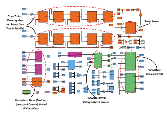 A simulation study of HTEMA was performed based on flow-down requirements. The simulation tool used was Simulink together with its SimPowerSystems (SPS) toolbox from MathWorks. Instead of using SPS library models, custom models were created for the permanent magnet synchronous motor, the motor drive, and some of the mechanical elements. The main reason for creating custom models is that the existing SPS models do not provide the flexibility needed for detailed study of the HTEMA.
