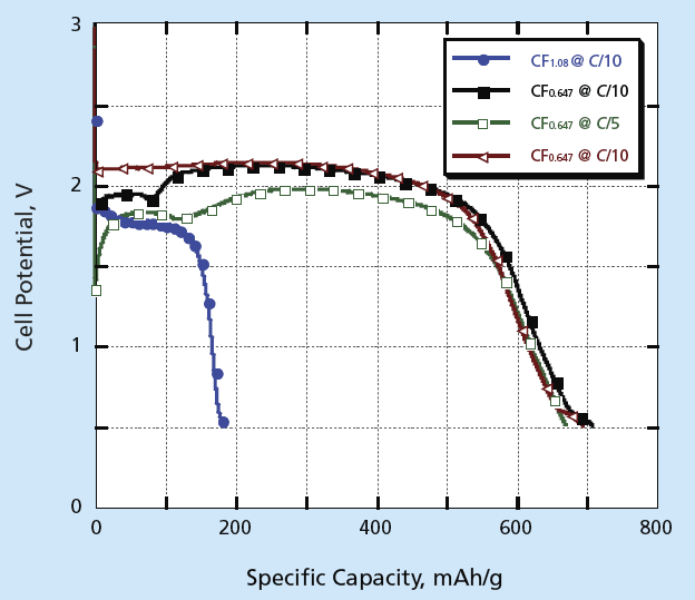 Each resulting cathode structure, 1 to 3 mils (about 0.025 to 0.076 mm) thick, was vacuum furnace dried, then incorporated into a standard coin cell case along with a separator, lithium foil anode, and an electrolyte consisting of LiBF4 dissolved at a concentration if 0.5 M in an 80/20 DME/PC (dimethoxy ethane/propylene carbonate) solvent mixture. The cells were tested in galvanostatic discharges at room temperature and –40 °C at currents from 2C to C/40. The fully fluorinated and sub-fluorinated cells performed comparably at rates as high as 2C at room temperature. At –40 °C, the sub-fluorinated cells exhibited approximately 3 times the specific capacities of the fully fluorinated cells when discharged at C/10 and C/5 discharge rates (see figure).