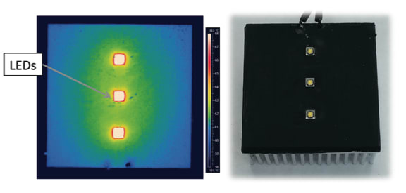 Recent work has explored adding heat pipes to the structure of metal core printed circuit boards (MCPCB) to help spread heat right at the source. You can see in Figure 4 an example of heat pipes embedded into an MCPCB. Heat pipes are seen on the left, in close proximity to the circuitry on the opposite side. The circuit side is seen in the image to the right of the embedded heat pipes. Figure 5 shows a picture of a three-LED heat sink (right) and a thermal image of the heat sink during operation. The temperature scale in Figure 5 is only 10°C, with a 68°C maximum temperature, which demonstrates the heat spreading capability of this concept. Measurements have shown that the embedded heat pipes can reduce the heat-spreading resistance by 45% over the standard aluminum MCPCB and even 15% over a copper MCPCB, which boasts a valuable improvement, particularly so close to the heat source.