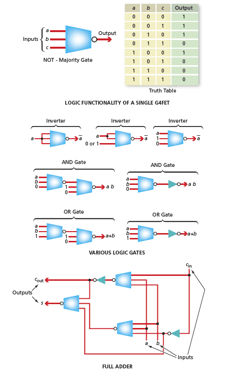 With proper choice of the specific dimensions for the gates, channels, and ancillary features of the generic G4-FET, the device could be made to function as a three-input, oneoutput logic gate. As illustrated by the truth table in the top part of the figure, the behavior of this logic gate would be the inverse (the NOT) of that of a majority gate. In other words, the device would function as a NOT-majority gate. By simply adding an inverter, one could obtain a majority gate. In contrast, to construct a majority gate in conventional complementary metal oxide/semiconductor (CMOS) circuitry, one would need four three-input AND gates and a four-input OR gate, altogether containing 32 transistors.