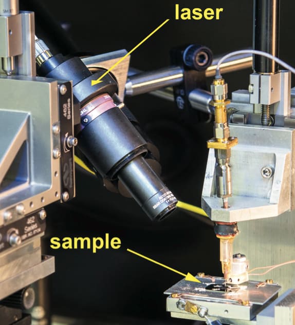 Deploying a nanowire as a probe tip sounds deceptively simple. The researchers obtain a conventional AFM cantilever and probe, remove the existing tip, and use a device called a focused ion beam to drill a hole about 5 micrometers deep in the tip mount. Then, using a minuscule manipulator, they break off a single nanowire from a “forest” of them grown by molecular beam epitaxy, insert the wire into the hole, and weld it in place. Finally, the wire is coated with thin layers of titanium (20 nm) and aluminum (200 nm) in order to conduct the microwave signal all the way to the end of the tip and back.