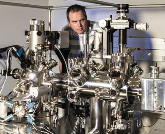 NSMM can produce very detailed imaging of the local density of positive and negative charge carriers inside a nanostructure — information of great practical significance to microde-vice fabricators — and scientists from PML’s Electromagnetics Division have made notable progress in the technique. They believe that the use of nanowire probes, in conjunction with the recent arrival of a brand-new, custom-built, four-probe NSMM instrument, will reveal new aspects of nanostructure composition and performance. In biological materials, it could locate the attachment of chemical agents or particles that are bound to a cell, and aid in the study of protein dynamics.